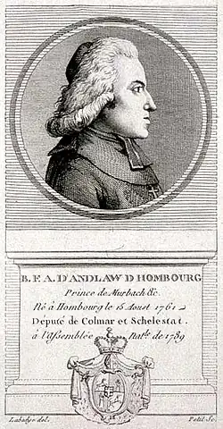 1789 zog Andlau-Homburg, als Deputierter der Geistlichen für die Bezirke Colmar und Schlettstadt, in die Verfassunggebende Nationalversammlung ein. Nach Verabschiedung der Zivilverfassung des Klerus und dem 1791 erfolgten Verbot von Papst Pius VI. dieses Gesetz anzuerkennen, verließ der Graf im gleichen Jahr Frankreich.