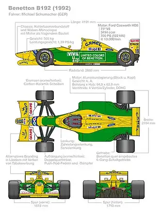 - ↑ 1992 Benetton B192 Cosworth Specifications. Abgerufen am 15. September 2025.
