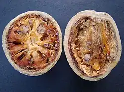Die mit einer Größe von 5–10 Zentimeter rundlichen bis birnenförmigen oder ellipsoiden, mehrsamigen Früchte, Beeren (Panzerbeere, Amphisarca) färben sich zur Reife grünlich- bis gelb-bräunlich. Die relativ glatte, kahle, leicht raue, manchmal schorfige, fleckige und harte Schale ist etwa 3–4 Millimeter dick. Darunter ist die orange-gelbe und pastös-faserige, klebrige und süße Pulpe und im segmentierten Kern liegen die einzelnen Samen jeweils in einem „Sack“ aus klebrigem, transparentem und zähem Schleim (Gummi), der sich beim Trocknen verfestigt. Die Pulpe wird, wenn sie austrocknet, hart und dunkelorange.