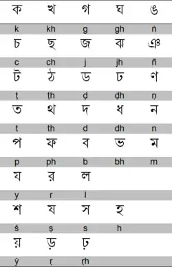 Die bengalische Schrift enthält 35 Konsonantenzeichen. Nicht berücksichtigt wurde bei der Zählung das ক্ষ kṣ, eigentlich eine Ligatur aus ক k und ষ ṣ, die allerdings von vielen bengalischen Wörterbüchern als eigenes Zeichen im Alphabet betrachtet wird.[10] Die Transliteration wird in dieser Tabelle ohne den inhärenten Vokal a dargestellt, der normalerweise immer vorhanden ist, wenn der Konsonant kein Vokalzeichen oder Virama besitzt.
