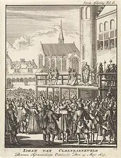 Moritz ließ unterdessen mit Hilfe von François van Aerssen am 29. August 1618[25] tatsächlich seinen einstigen Mitstreiter und aktuellen politischen Gegner Oldenbarnevelt verhaften. Oldenbarnevelts Verbündete Hugo Grotius und Rombout Hogerbeets wurden zu lebenslanger Kerkerhaft auf Festung Loevestein verurteilt, und die Amsterdamer Regenten Jakob de Graeff Dircksz und Cornelis Hooft wurden von Reinier Pauw zeitweilig ihres Amtes enthoben.