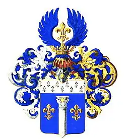 Im azurblauen Schild mit Hermelin-Schildhaupt eine aus dem Schildfuß wachsende silberne Säule, flankiert jeweils von einer goldenen Lilie. Auf dem bekrönten Helm mit rechts blau-silbernen, links blau-goldenen Helmdecken eine goldene Lilie zwischen einem blauen Flug.[7]