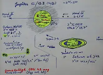 Jupiter und Saturn mit drei bzw. vier ihrer Monde. Links auf Jupiter ein dunkler Fleck, der fast wie ein Mondschatten aussieht; roter Pfeil = Rotation in 20 min. Rechts taucht gerade Mond II auf.