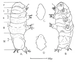 Die Beine ließen sich vermutlich teleskopartig einziehen und tragen je vier ungleich lange und in Bezug auf die Beinmittelebene asymmetrisch angeordnete Klauen. Andere Merkmale wie die Struktur des Stilettapparats oder der Schlundmuskulatur lassen sich nicht erkennen; auch die Lage der Geschlechtsöffnung (Gonopore) in Bezug auf den Anus, die weitere Hinweise auf die Klassenzugehörigkeit der Art hätte geben können, ist nicht feststellbar.