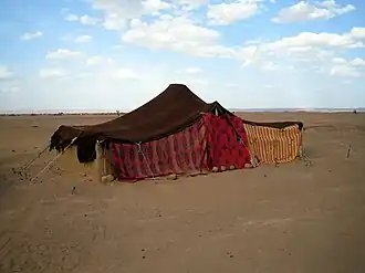 Unterwegs lebte man in leicht zu transportierenden und schnell auf- und abzubauenden Zelten aus schwarzem Ziegen- und braunem Kamelhaar, die von den Frauen auf einfachen Hüftwebrahmen gewebt und aus mehreren etwa 50 cm breiten und ca. 5 m langen Bahnen zusammengenäht wurden. Die so entstandene breite Zeltbahn wurde üblicherweise über mindestens sechs (oft auch mehr) Holzstäbe gespannt, von denen die beiden mittleren etwa 2 m hoch waren; die seitlichen Pflöcke hatten dagegen meist nur eine Höhe von 50 bis 80 cm. Insgesamt ergab sich meist eine Zeltbreite von etwa 10 m und eine Tiefe von etwa 3 m. Die Zelte boten in erster Linie Schutz vor heftigem Wind und vor Sandstürmen, ein wenig auch vor der nächtlichen Kühle; bei den äußerst seltenen Regenfällen waren ihre Vorteile dagegen begrenzt. Während die dem Wind am stärksten ausgesetzte Rückseite der Zelte immer geschlossen blieb, wurden die nächtens herabhängenden Stoffbahnen der Vorderseite tagsüber hochgeklappt. Aufgrund ihrer Herstellungsweise waren die Berberzelte immer längsrechteckig und unterschieden sich somit deutlich von den Rundzelten (Jurten) asiatischer Nomadenvölker.