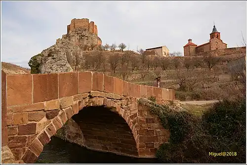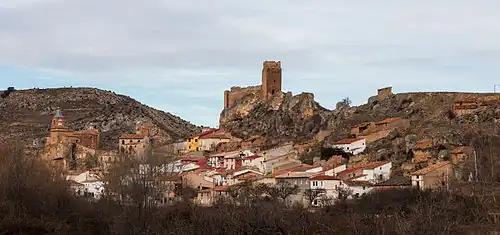 - Von der bereits im 12. Jahrhundert existierenden und im Krieg gegen Kastilien im 14. Jahrhundert zerstörten Burg (castillo) stehen noch Reste des ehemals ca. 15 m hohen Bergfrieds (torre del homenaje) und der Burgmauern. Im Burghof befindet sich eine abgedeckte Zisterne (aljibe)[7][8]