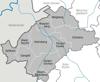 Das Steinkohlevorkommen des Erkelenzer Horsts wird zum Aachener Revier gezählt.[1][2] Friedrich Honigmann wies durch Bohrungen 1885 in der Gegend von Hückelhoven Steinkohle in einer Teufe von 180 bis 220 Metern nach.[3] Die Steinkohle wurde von 1914 bis 1997 gefördert. Die Zeche Carolus-Magnus hatte 1930 3.320 Beschäftigte; die Zeche Sophia-Jacoba hatte 1959 den Höchststand von 5669 Beschäftigten. Ab 1912 wurden Werkssiedlungen errichtet; so stammten 1990 etwa 40 % des gesamten Wohnungsbestandes von Übach-Palenberg aus dem Werksiedlungsbau der Gewerkschaft Carolus Magnus und der Aachener Bergmannsiedlungsgesellschaft.[4] 2008 schloss die Bricketfabrik.[5] Zu den Relikten des Steinkohlebergbaus zählen die Halde Carolus Magnus, die Millicher Halde und die Ratheimer Halde.[6] Auf dem Gebiet des Kreises liegt das Westfeld des Braunkohle-Tagebaus Garzweiler. Betroffen ist unter anderem der Ort Lützerath im Raum Erkelenz.