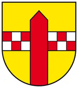 Blasonierung: „In Gold ein rot-silbern zweireihig geschachteter Balken, darübergelegt ein oben verkürzter und zugespitzter roter Pfahl.“