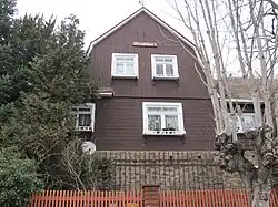 Das eingeschossige Holzhaus steht giebelständig oberhalb einer das Gelände zur Straße hin abfangenden Bruchsteinmauer mit einem Durchlass für den Eingang. Es wurde auf einem ortstypisch aus Syenit bestehenden Bruchsteinsockel errichtet. Das Erdgeschoss ist waagerecht verbrettert, der sich darüber zur Straße erhebende, geknickte Giebel ist dagegen senkrecht verbrettert. Das hohe Dach hat eine Ziegeldeckung.
