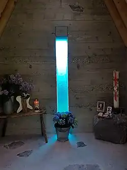 Das Satteldach ist mit Holzschindeln gedeckt, wobei der Dachfirst nicht ausgeführt wurde, sondern sich an dessen Stelle ein Lichtdurchlass auf die ganze Länge der Kapelle befindet, wodurch interessante Lichteffekte im Innenraum hervorgerufen werden. Eine weitere Lichtquelle befindet sich der Türe gegenüber, realisiert durch einen etwa zwei Meter hohen, ca. 20 cm breiten Schlitz mit bläulichem, undurchsichtigem Glas in der Betonsteinwand.
