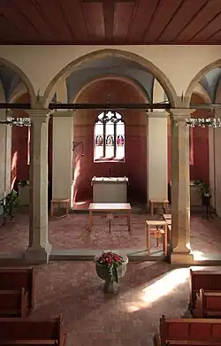 Das Langhaus wird von einer schlichten dunkelbraunen Holzdecke überspannt. Der Chorraum ist vom Langhaus um eine Stufe abgehoben und wird räumlich durch drei Spitzbögen optisch abgetrennt. Der mittlere dieser Bögen ist breiter als die anderen beiden und nimmt damit die Gestaltung der mittleren Konche vorweg. Seit der Neugestaltung des Kircheninnern im Jahr 2006 sind die drei Konchen farbig gefasst. Der untere Teil ist in rötlichen Tönen gehalten und geht in Gelbtöne über. In der mittleren Apsis sind auf sternenbemaltem Grund die vier Evangelistensymbole zu erkennen, welche das Lamm Gottes umgeben. Das Kreuzgratgewölbe zwischen Konchen und den Spitzbögen ist blau gehalten. Neben dem Eingang zur Sakristei befindet sich ein gotisches Kruzifix. Vor den Bankreihen befinden sich der Taufstein und dahinter der moderne Volksaltar.