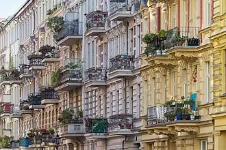 In den Erdgeschossbereichen der Mietwohnhäuser entlang der Straße fanden anfangs Bäcker, Schuhmacher, Fleischer sowie Zigarren- und Kohlenhändler Platz für ihre Dienstleistungen. Heute finden sich Cafés und Gaststätten sowie anderes Gewerbe und Wohnungen in den Erdgeschossen. Die mehrgeschossigen Bürgerbauten wurden durch Quer- und Hofflügel ergänzt, sodass häufig bis zu 30 Mietsparteien unter einer Hausnummer genannt wurden.