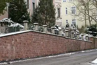 Zu dem Anwesen gehört die ebenfalls 1885 entstandene, auf einer Hausteinstützmauer befindliche Einfriedung. Die Pfeiler der Einfriedung sind mit Schmiedeeisengittern ausgestattet.