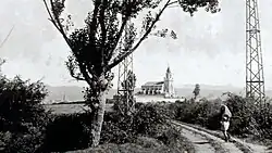 Bergwerksbahn oberhalb des Nordbahnhofs von Oviedo, der sich unter dem Hügel von San Pedro da Los Arcos befindet, neben der gleichnamigen Kirche im Hintergrund