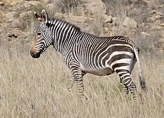 - Kap-Bergzebra (E. z. zebra Linnaeus, 1758); südlichere und kleinere Unterart mit breiteren schwarzen Streifen