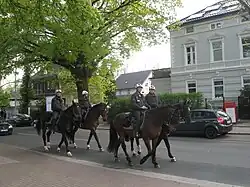 - Hamburg schaffte seine Reiterstaffel 1975 aus Kostengründen ab, führte sie aber im September 2010 mit zehn Reitern und neun geleasten Pferden wieder ein.[12][13] Nach dem Regierungswechsel im Frühjahr 2011 beschloss die Bürgerschaft im November 2011, Effektivität und Kosten der Staffel zu überprüfen.[14] Aufgrund der Wirksamkeit der Polizeireiterstaffel wurde 2012 beschlossen, die Staffel nicht aufzulösen.[15][16]