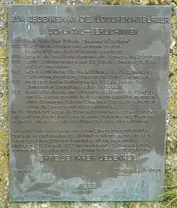 In Berlichingen befand sich früher eine große jüdische Gemeinde, die ihren Ursprung in der Ansiedlung von Juden durch die Freiherren von Berlichingen im 16. Jahrhundert hatte. Der Jüdische Friedhof Berlichingen wurden 1586 erstmals erwähnt. Der Friedhof ist der größte jüdische Friedhof in Nordwürttemberg, der zahlreichen jüdischen Gemeinden der Umgebung als Begräbnisplatz diente. 1791 bzw. 1806 erbaute die jüdische Gemeinde eine Synagoge, 1807 wurden 128 jüdische Einwohner gezählt. 1832 wurde Berlichingen Sitz des Bezirksrabbinats Berlichingen. 1854 wurden 249 Juden gezählt. Die Berlichinger Juden waren insbesondere auch von wirtschaftlicher Bedeutung für den Ort, der sich zu einem Mittelpunkt für ein größeres Hinterland entwickelte. Ab der Mitte des 19. Jahrhunderts ging die Gemeindegröße durch Abwanderung stetig zurück. Im Jahr 1900 wurden nur noch 89 Juden gezählt. Gleichzeitig sank auch die wirtschaftliche Bedeutung des Ortes. 1933 gab es noch 68 Juden in Berlichingen, von denen vielen während der NS-Zeit noch die Auswanderung gelang. Während der Novemberpogrome 1938 wurden die Synagoge und einige Wohnhäuser jüdischer Bürger von einheimischen und auswärtigen SA-Männern demoliert, einige jüdische Männer wurden in das KZ Dachau deportiert. Die jüdische Gemeinde wurde 1939 aufgelöst, die Synagoge später abgerissen. Die zurückgebliebenen jüdischen Bürger wurden Ende November 1941 per LKW in das Stuttgarter Sammellager „Auf dem Killesberg“ verbracht und von dort ins Ghetto von Riga deportiert; Mitte August 1942 wurden die letzten vier Juden in das Ghetto Theresienstadt deportiert.[6] Von den 68 Juden, die 1933 noch in Berlichingen lebten, kamen nach 1938 mindestens 20 Personen durch Deportationen ums Leben. 1985 wurde ein Gedenkstein angebracht.[7]