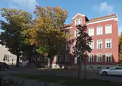 Diese Bildungseinrichtung am östlichen Bereich des Angers wurde im Jahr 1870 als erste Mädchenschule in Friedrichsfelde eröffnet.[13] Um 1900 erfuhr das Schulgebäude den ersten Umbau (Aufstockung). Der um 1920 durchgeführte An- und Umbau veranlasste die Verwaltung des gerade gebildeten Bezirks Lichtenberg dazu, hier mehrere Dienststellen einzurichten. Das Haus wurde damit zum Stadthaus. Ein Schulbetrieb war hier nicht mehr möglich. In der DDR-Zeit befand sich in dem Gebäude eine Polizeifiliale mit Gefängnis. Nach der Wende wurde nur der Erdgeschossbereich wieder genutzt, eine Filiale der Jugendweihe-Organisation hatte sich hier eingerichtet.