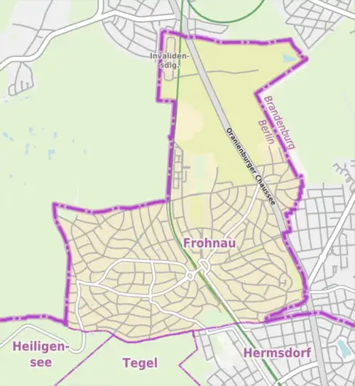 Der in den 1930er Jahren entstandene Plan, den nördlichen Teil des Berliner Autobahnringes durch den Wald im Norden Frohnaus zu führen, wurde nicht realisiert.[8] Im äußersten Norden Frohnaus entstand 1938 die Invalidensiedlung auf einem hufeisenförmigen Grundriss.[9] Ihr Haupteingang war nach Norden zum brandenburgischen Hohen Neuendorf hin orientiert.