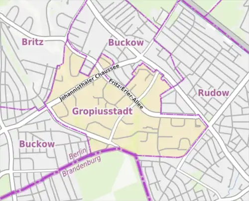 - Das Britzer Gebiet der Gropiusstadt liegt nordwestlich der Johannisthaler Chaussee und südlich der Fritz-Erler-Allee zwischen den U-Bahnhöfen Britz-Süd und Johannisthaler Chaussee. Dieses Gebiet umfasst die Bereiche 1–3.[1]
