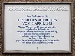 - ↑ 25.11.2022: Einweihung der Gedenktafel für die Opfer des „Rahnsdorfer Brotaufruhrs“ vom 6. April 1945. Bezirksamt Treptow-Köpenick, Pressemitteilung.
