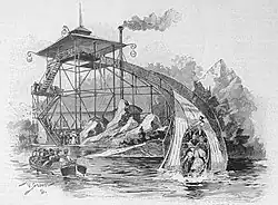 Weitere Attraktionen waren das Alpenpanorama, die Marine-Schauspiele und das Gebäude der Stadt Berlin. Die temporäre Kulisse des Alpenpanoramas wurde von den Berliner Firmen Boswau & Knauer und Carl Rabitz mit dessen Draht- und Putzwandbauweise errichtet.[26] Die Industriehalle selbst war wegen ihrer Architektur, Größe und Formensprache damals berühmt. Eine Erinnerung an die Bauart findet sich in der Oberbaumbrücke, die zeitgleich mit der Gewerbeausstellung von 1894 bis 1896 etwas flussabwärts errichtet wurde und die noch steht.