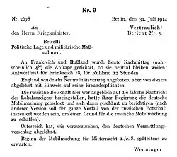 In der höchst angespannten politischen Situation in den letzten Tagen der Julikrise nach der Kriegserklärung Österreich-Ungarns an Serbien und der daraufhin erfolgten russischen Teilmobilmachung ließ der Berliner Lokal-Anzeiger am frühen Nachmittag des 30. Juli 1914 gegen 14:30 Uhr ein vorbereitetes Extrablatt mit der Schlagzeile „Die Entscheidung ist gefallen!“ drucken, in dem er die falsche Nachricht verbreitete, Kaiser Wilhelm II. habe die sofortige Mobilmachung der deutschen Truppen befohlen. Obwohl dies vom Auswärtigen Amt umgehend dementiert wurde und auch die Zeitung selbst am Abend einen Rückzieher machte (das Extrablatt sei „durch einen groben Unfug verbreitet“ worden), wurde die Meldung vor dem Hintergrund der hektischen Nachrichtenlage von verschiedenen in- und ausländischen Akteuren, darunter angeblich die russische Botschaft in Berlin, für wahr gehalten. Bis heute ist unklar, inwieweit diese Falschmeldung Einfluss auf die Entscheidung von Zar Nikolaus II. hatte, am gleichen Nachmittag für das Russische Reich die Generalmobilmachung zu beschließen, was dann unmittelbar den Ausbruch des Ersten Weltkriegs veranlasste.[2][3][4] Der Medienhistoriker Holger Böning stellte 2015 fest, dass auch die zum einhundertsten Jahrestag des Kriegsausbruchs neu erschienene Forschungsliteratur keine Erkenntnisse darüber erbracht hat, welche Akteure hinter dem „mysteriösen Extrablatt“ standen. Nach seiner Einschätzung wurde zweifellos „die Presse genutzt, um die Krise zu verschärfen“.[5]
