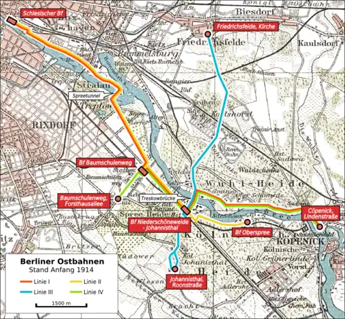 Ebenfalls im April 1913 wurde vom Bahnhof Niederschöneweide-Johannisthal aus eine Strecke über Grünauer Straße (heute: Michael-Brückner-Straße), Hasselwerderstraße, Berliner Straße (heute: Schnellerstraße) und Sedanstraße (heute: Bruno-Bürgel-Weg) zum Bahnhof Oberspree eingerichtet.[4] Die Linie verkehrte von Oberspree aus über Niederschöneweide und durch den Spreetunnel zum Schlesischen Bahnhof.
