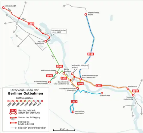 Infolge der bis 1908 bestehenden Netztrennung verfügten die Berliner Ostbahnen über zwei Betriebshöfe in Stralau und Niederschöneweide. Die Höfe wurden zusammen mit den jeweils ersten Strecken in den Jahren 1899 beziehungsweise 1901 eröffnet.