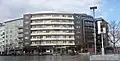 Wohngebäude und ein Bürogebäude. Der bogenförmige Verlauf deutet den Zugangsverlauf zur Rheinbrücke vor 1959 an. |