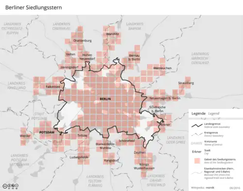 Die Metropolregion Berlin-Brandenburg wächst nicht gleichförmig, sondern besitzt eine Gebietskulisse. Die Ausbreitung von Siedlungen und die Entwicklung von Umlandgemeinden rund um Berlin geschieht viel mehr durch eine gesteuerte Planung die im Landesentwicklungsplan zwischen Berlin und Brandenburg festgehalten ist.[1][2] Neue Wohngebiete dürfen diesem Plan und der Systematik des Siedlungssterns nach nur entlang der Schienenstränge der S-Bahn und der Regionalbahn entstehen. Die dazwischenliegenden Gebiete sollen als Freiräume und weniger verdichtete Gebiete erhalten bleiben.