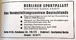 - ↑ Alfons Arenhövel: Arena der Leidenschaften. Der Berliner Sportpalast und seine Veranstaltungen 1910–1973. Berlin 1990, S. 353.