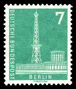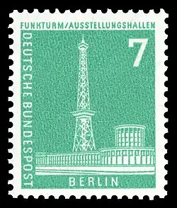 7 | Berliner Stadtbilder (I)[6] Funkturm und Ausstellungshallen bläulichgrün; die 7-Pfennig-Marke der zweiten Teilserie (Nr. 142) weist eine etwas veränderte Zeichnung auf |
