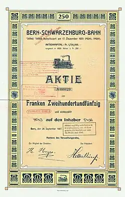 - ↑ Bern-Schwarzenburg-Bahn. In: HIWEPA – Die Plattform für Historische Wertpapiere. Abgerufen am 25. Juni 2025.