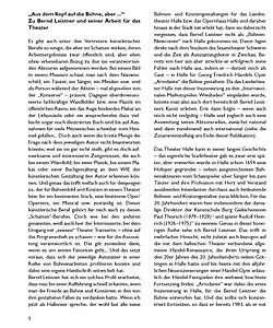 - Hans-Georg Sehrt: Bühne archiviert!? Findbuchsplitter der Arbeiten des Künstlers Bernd Leistner. S. 22, 36–38, 43–46, In: Mitteilungen, Freundes- und Förderkreis des Händelhauses zu Halle e. V., 1/2013, S. 26, 27.