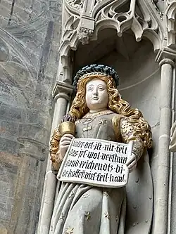 Im Gleichnis gibt es fünf törichte und fünf kluge Jungfrauen, die alle auf ihren Bräutigam warten. Dieses Motiv wird auch am Strassburger Münster und am Basler Münster gezeigt.[8][9] Ein Engel, als Diakon gekleidet, führt die klugen Jungfrauen an, deren bräutlicher Prunk an niederländische Kunst erinnert. Seine Schriftrolle enthält die Worte: