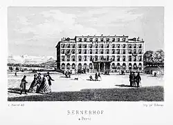Als grösster Konkurrent erwies sich das 1865 eröffnete Hotel Bellevue Palace an der Inselgasse (heutige Kochergasse). Die Bundesbehörden bevorzugten keines der Häuser, sondern verteilten Staatsanlässe und die Neujahrsessen mit dem diplomatischen Corps gleichmässig. Zahlreiche prominente Personen stiegen im Bernerhof ab. Dazu gehörten unter anderem die russische Zarin Marija Alexandrowna, der französische Kaiser Napoleon III., der siamesische König Chulalongkorn, der britische König Edward VII., der amerikanische Präsident Ulysses S. Grant sowie zahlreiche Vertreter von Wirtschaft, Kunst und Kultur. Letzter gesellschaftlicher Höhepunkt im Bernerhof war das Bankett anlässlich des Staatsbesuchs des deutschen Kaisers Wilhelm II. im September 1912.[6]
