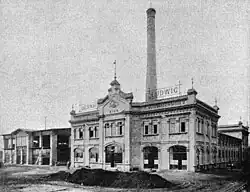 Die Fabrik wurde ab 1. Jänner 1898 in der heutigen Färbermühlgasse 13 (vormals Gärtnergasse) betrieben, spätere Nebengebäude befanden sich in der Perchtoldsdorfer Straße 21 und 23–25. Ihre Gebäude waren von den Architekten Bernhard Ludwig (1866–1939) und Ferdinand Berchinak nach den Angaben von Bernhards 1897 verstorbenen Vaters Bernhard Hieronymus Ludwig erbaut worden.[1] 1901 arbeiteten dort bereits etwa 200 Personen. Die Dampfmaschine, mit einer bis zu 150 PS zu steigernden Leistung, lieferte die Betriebskraft für die Holzbearbeitungsmaschinen der Möbel und Bautischlerei, die elektrische Beleuchtung der ganzen Anlage sowie für die Block- und Fourniersägen, die Furnierschälmaschine, die Maschinen zur Erzeugung weicher und harter Fußböden und des Sägewerkes. Ein etwa ein Kilometer langes, schmalspuriges Schleppgleis vermittelte den Verkehr innerhalb des Fabriksgebäudes und den Holzplätzen, auf denen um 1900 etwa 300 Waggons Hart- und Weichholz, teils im geschnittenen Zustand, teils als Rundholz lagerten.