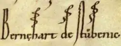 Bernhard von Stübing (urkundlich erstmals ca. 1120–1125; † 1152),[1] auch Bero oder Benno, war ein hochfreier Adeliger, Enkel des Aribo II., Mitte des 12. Jahrhunderts Besitzer des Grazer Bodens und erster namentlich bekannter Besitzer des Schlosses Stübing. Er gilt auch als Erbauer der Herrschaftsburg auf dem Grazer Schloßberg und als Gründer des ersten Grazer Marktes („Erster Sack“, Sackstraße) sowie, sehr wahrscheinlich, als Namensgeber von Berndorf (jetzt in Hausmannstätten eingemeindet).[2] Er war der Vater von Konrad von Feistritz und von Adalram, die am 3. August 1151 wegen angeblichen Hochverrats enthauptet worden waren.[3] Der jüngste Bruder der Hingerichteten, Ulrich von Graz, trat in das Stift Seckau ein.[4] Dessen Besitz Graz wurde ca. 1156 von Markgraf Ottokar III. eingezogen.