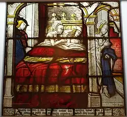 Die Scheibe stammt aus einem Zyklus über das Leben des heiligen Bernhard, sie ist ca. 73 cm breit und 67,8 cm hoch. Wieder soll Bernhard von einem jungen Mädchen verführt werden, das unbekleidet in seinem Bett liegt. Bernhard widersteht der Versuchung und als das Mädchen dies erkennt, verlässt es, den Mantel über den Arm gelehnt, sein Schlafgemach. Beide Szenen werden nebeneinander in einer Simultandarstellung gezeigt und durch die architektonische Rahmung getrennt. Links vom Bett steht ein Jüngling, dessen Bedeutung nicht klar ist. Möglicherweise handelt sich hierbei um eine spätere Ergänzung.