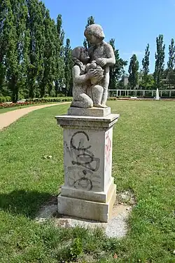 Das Ende des Hauptweges wird durch zwei nach historischen Fotos rekonstruierte Statuetten, die Kinder mit Tieren darstellen, markiert. In der Mittelachse befindet sich ein Wasserbecken mit einstrahliger Fontäne. Die vor dem Wasserbecken liegende Rasenfläche wird wie das Becken von bogenförmig verlaufenden Wegen umschlossen. An das Becken schließt sich eine Holzpergola mit Sitzbänken an.