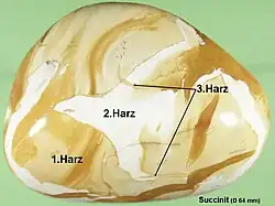 Von der Bernsteinart Succinit werden Varietäten insbesondere nach dem Grad einer Trübung unterschieden, charakteristisch sind die fließenden Übergänge und Vermischungen in den einzelnen Stücken: