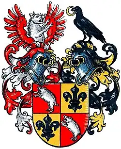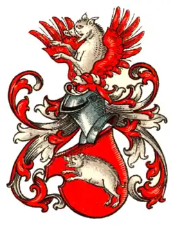 Das Stammwappen zeigt in Rot einen springenden silbernen Eber. Auf dem Helm der Eber wachsend zwischen einem offenen roten Flug. Die Helmdecken sind rot-silbern.