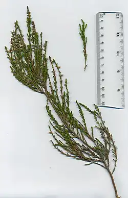 Die Besenheide ist ein verholzender und immergrüner Zwergstrauch, der relativ langsam wächst und etwa 40 Jahre alt werden kann. Seine Wuchshöhe beträgt 30 bis 100 Zentimeter, letztere setzt eine ungestörte Entwicklung voraus. Die Besenheide ist ein Tiefwurzler mit einer endotrophen Mykorrhiza vom Ericaceen-Typ. Sie unterscheidet sich von den verwandten und teilweise recht ähnlichen Erika-Arten durch schuppenförmig an den Ästchen anliegende und nach oben eingerollte, ledrige gegenständige Blätter, die nur 1 bis 3,5 Millimeter lang sind. Sie sind vierzeilig angeordnet und decken sich dachig.[1] Sie tragen am Grund 2 lange, spitze, am Rand drüsige, abwärts gerichtete Sporne oder Öhrchen.[1] Spaltöffnungen befinden sich nur an der Blattunterseite und sind von Haaren geschützt.