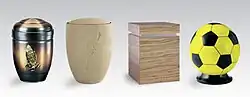Weil die Aschebehälter in Deutschland über mehrere Jahrzehnte oberirdisch aufgestellt werden durften, bevorzugte man dafür beständige Materialien, vorzugsweise Stein.[5] In solche Überurnen wurde der Aschebehälter eingesetzt. Die Bestattungsgefäße wurden vielfach aus Naturstein gefertigt: Granit, Marmor, Sandstein, Porphyr, Muschelkalk, Travertin, Serpentinit. In einfacheren Fällen kommen Metalle zum Einsatz: Eisen, Bronze, Zink, Kupfer.