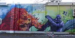 | Kinderrechte | 2019 | kL52, Style Scouts[4] | Der Graffitiartist kL52 und die Nürnberger Graffiti-Akademie Style Scouts unterstützten die Kinder des Familienzentrums und Anwohner bei der Wandgestaltung. | Imbuschstraße 70–72 49° 24′ 6″ N, 11° 8′ 44″ O |
