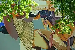 | Wurzeln und Flügel | 2020 | Julian Vogel[4] | Julian Vogel bezieht sich mit diesem Mural auf die Skulpturen Allegorien des Wasser von 1971, die man ebenfalls in Langwasser findet. Die umliegenden Bäume sind nach Vogel als Teil oder Erweiterung des Bildes zu betrachten. | Giesbertsstraße 41 49° 24′ 2″ N, 11° 8′ 23″ O |
