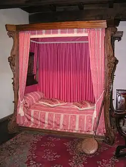 Das Hauptbett für das Ehepaar bildete das hervorragendste Möbel der Kemenate. Bereits damals wurden die Vorhänge und die Betthimmel Mode, und an Letzteren befestigte man Hängelampen als Nachtlicht. Das Kopfende des Bettes wurde stets an die Wand gestellt, so dass man von beiden Seiten in das Bett steigen konnte. Dabei aber ließ man zwischen Bett und Wand an der einen Seite einen nicht zu breiten Raum (la ruelle) als Empfangsort für intime Freunde, der Anfang des späteren Boudoirs (ein kleines, elegantes Damenzimmer).