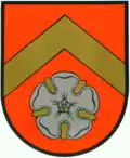 Das Wappen zeigt auf rotem Grund einen hellbraunen Sparren des Dachstuhls der Dorfkirche, darunter eine Rose, die an das Rittergeschlecht von Saldern erinnert.