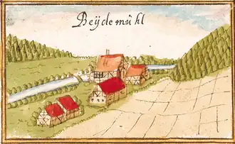 ![]() Die Beutenmühle, im Jahre 1685 vom Hang rechts des unterhalb mündenden Lindenbachs aus gesehen. Es fehlt der aus dem Lindenbachtal zulaufende Hangkanal, der wohl das quer zur Fließrichtung des Beutenbachs stehende Mühlrad antrieb. | ||